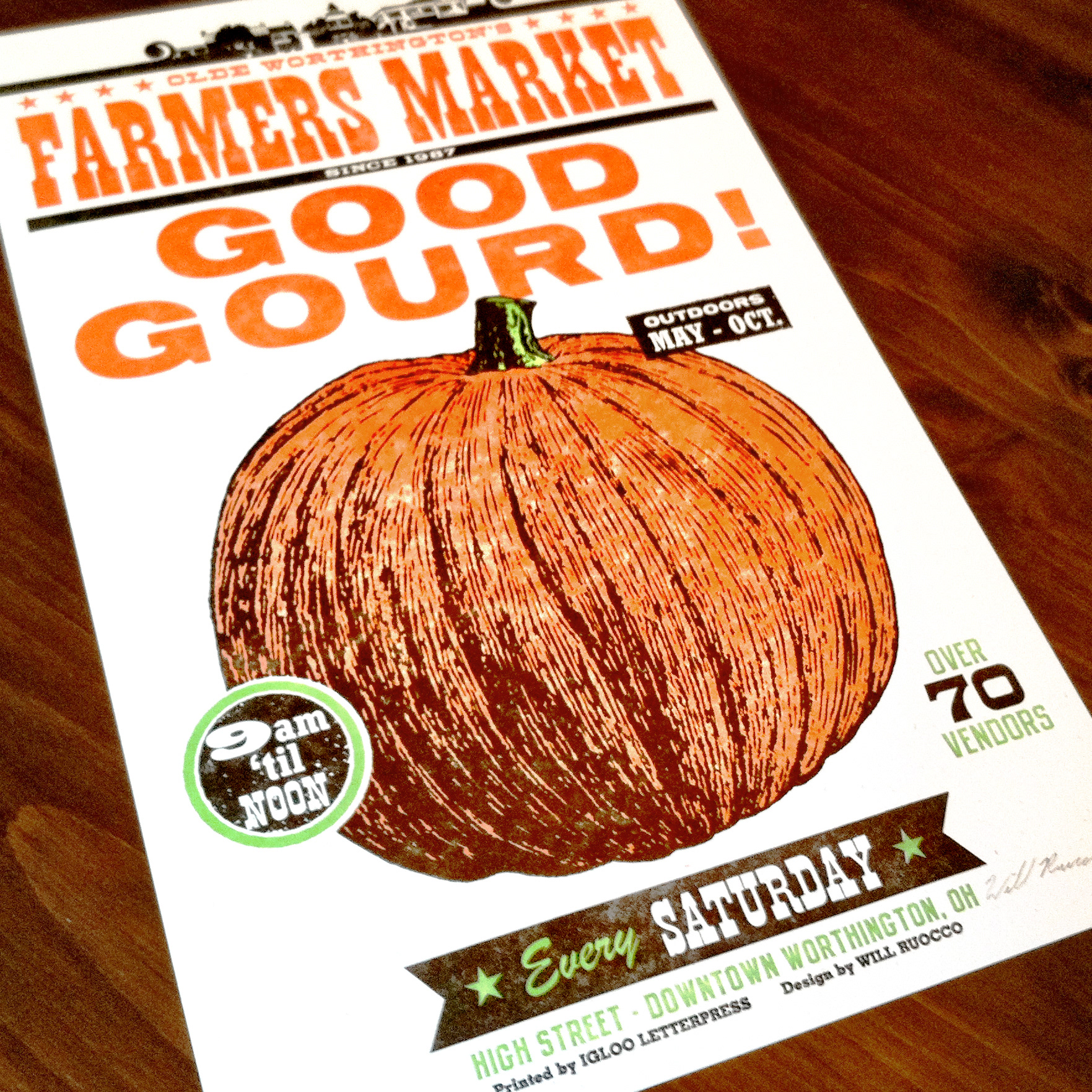 GOOD GOURD! This authentic letterpress print was designed to promote Worthington Ohio's local Farmer's Market. Beautifully printed by Igloo Letterpress on French Paper Company's Madero Beach coverstock. Ltd. Ed. - signed & numbered.